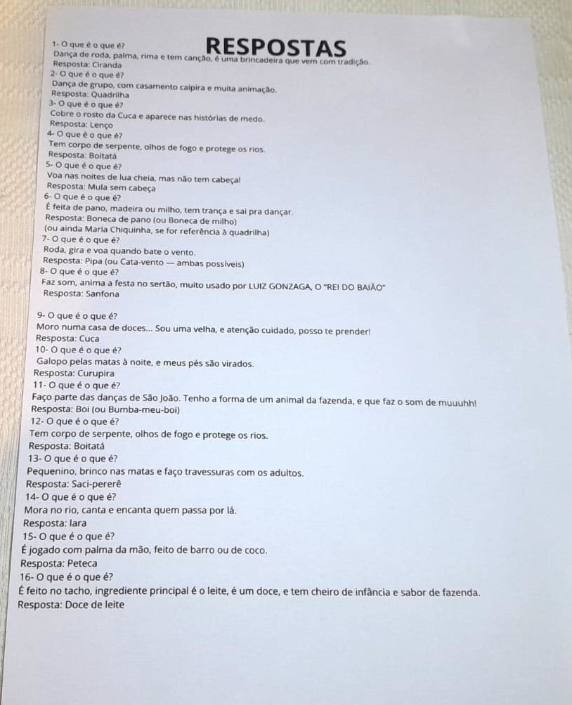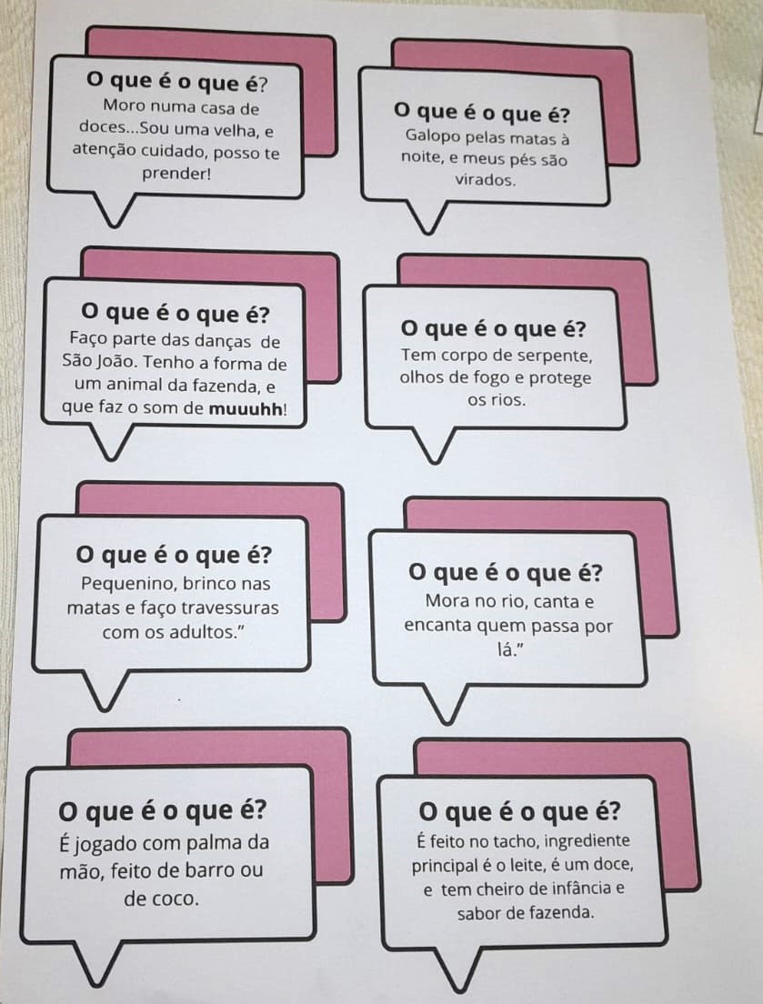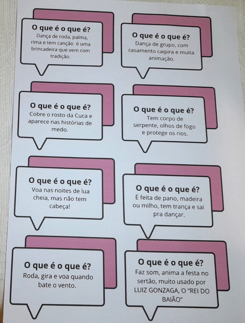 O jogo O que é o que é? traz adivinhas lúdicas sobre danças, lendas e tradições, estimulando raciocínio, memória e valorizando nossa cultura. Ideal para trabalhar em sala de aula ou em família.